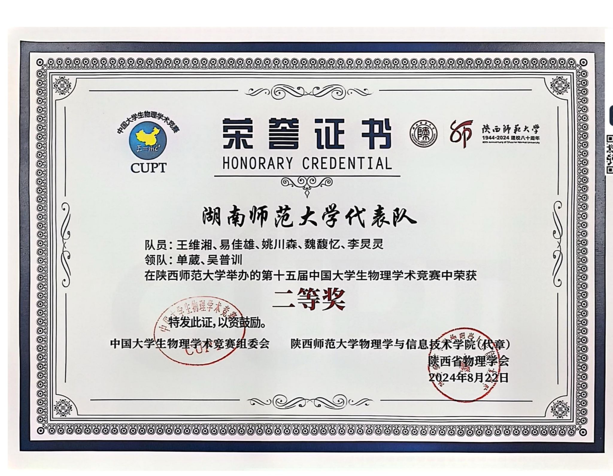 2024年第十五届中国大学生物理学术竞赛获奖