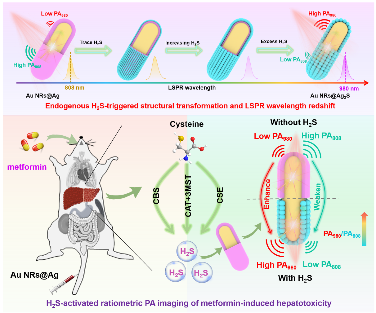 基于此,曾松军教授课题组发展了内源性H2S触发的局域表面等离子体共振(LSPR)调控新策略,构建了一种精确可靠的新型纳米探针(Au NRs@Ag),用于体内H2S的实时动态比率光声成像。设计的Au NRs@Ag纳米探针被H2S激活后原位形成Au NRs@Ag2S,导致LSPR波长从808到980 nm的显著红移,并成功实现了二甲双胍诱导肝损伤疾病的动态比率光声成像监测。这为内源性H2S的体内实时监测及其相关联疾病的原位精准诊断提供了新的比率光声成像方法。