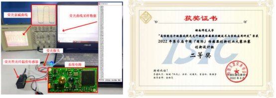 2022年第六届中国(国际)传感器创新创业大赛中,由金湘亮教授指导、博士生杨健为组长的研究生团队完成的项目《高性能芯片级集成荧光光纤温度传感器关键技术与系统应用研发》经大赛评委会评审顺利进入全国决赛,最终荣获全国创新设计组二等奖。