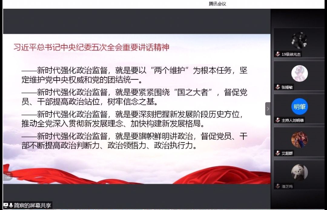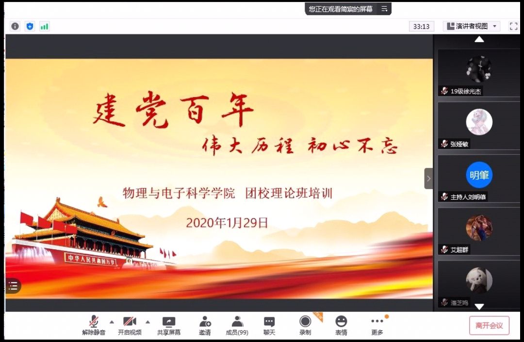 1月29日中午,由太阳成集团tyc团委青发部组织的第三期知行团校理论培训班第二次培训会以腾讯线上会议的形式举行。2019级、2020级理论培训班全体学员参与此次培训。