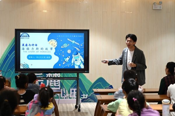 活动开始前,志愿者们协助现场人员进行签到,并维持了现场活动秩序,营造了融洽的课堂氛围。课程分为星座与神话的基本介绍,海格力斯的故事,虚拟天文馆中的星座三个部分。姚睿采用图文并茂的形式,讲解了与天文学相关的神话故事,激发了小朋友们及其家长的学习兴趣。课堂过程中,姚睿与小朋友们互动,进行了模拟天体运动的小游戏,帮助孩子们更好理解星座出现的原理,并运用“虚拟天文馆”程序直观地演示了星宿的方位和运动轨迹。活动现场,小朋友们及其陪同家长热情高涨,参与度高。活动结束后,物电院志愿者们和岳麓区图书馆工作人员一同整理现场,维护图书馆的整洁。