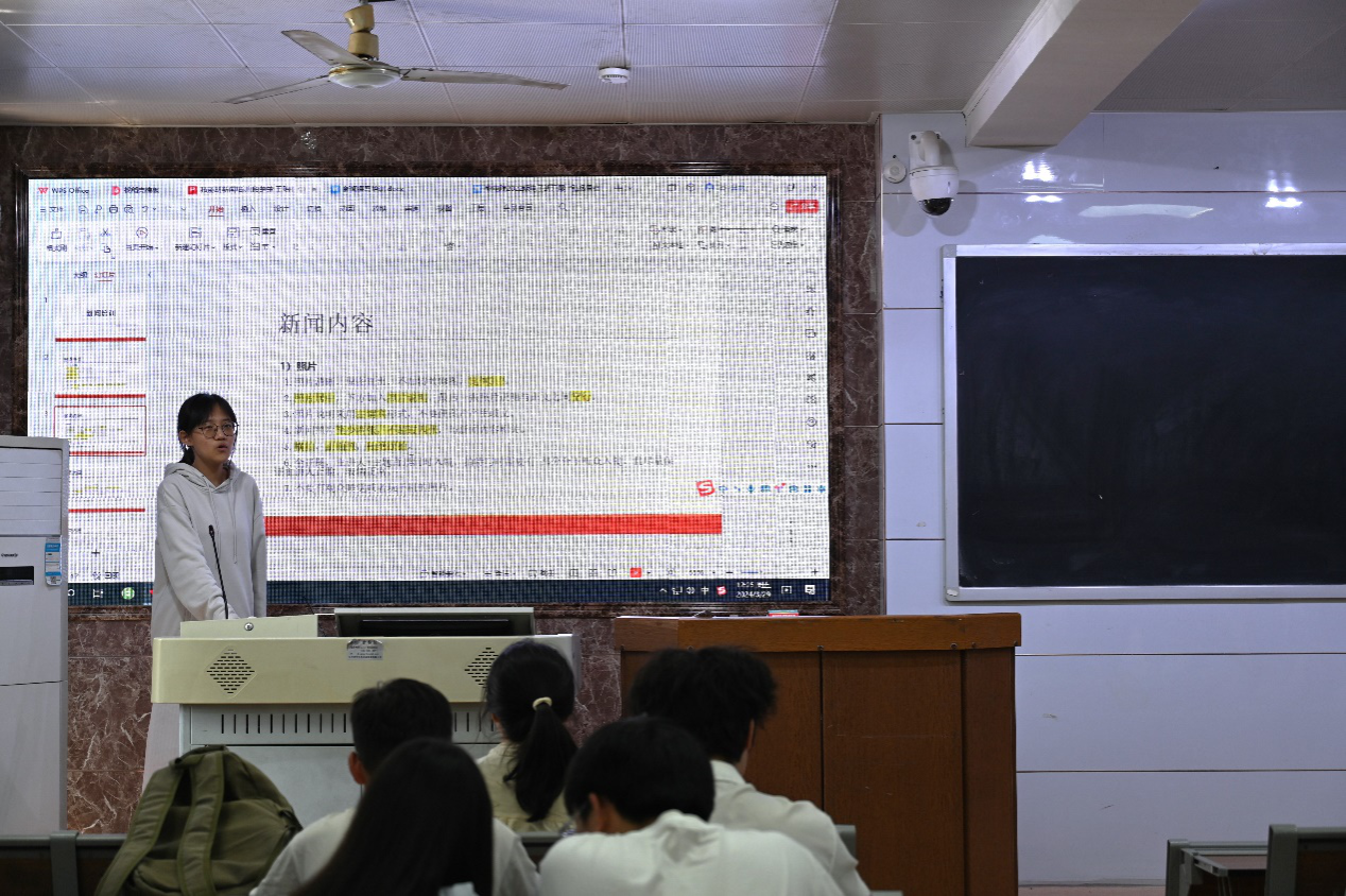 段楚楚从新闻标题和新闻内容两部分向学员们介绍了新闻的格式要求。她强调了新闻标题对概括性的要求,并从照片、导语、正文和结尾四个方面介绍了新闻内容的要求:新闻照片应当清晰,并附上对应的图片说明;导语部分需要写明通讯员和事件的原因、时间、人物等信息;新闻正文要求用简洁通顺的语言写清楚新闻事件的内容;新闻结尾则多以阐述活动的意义作为结尾。