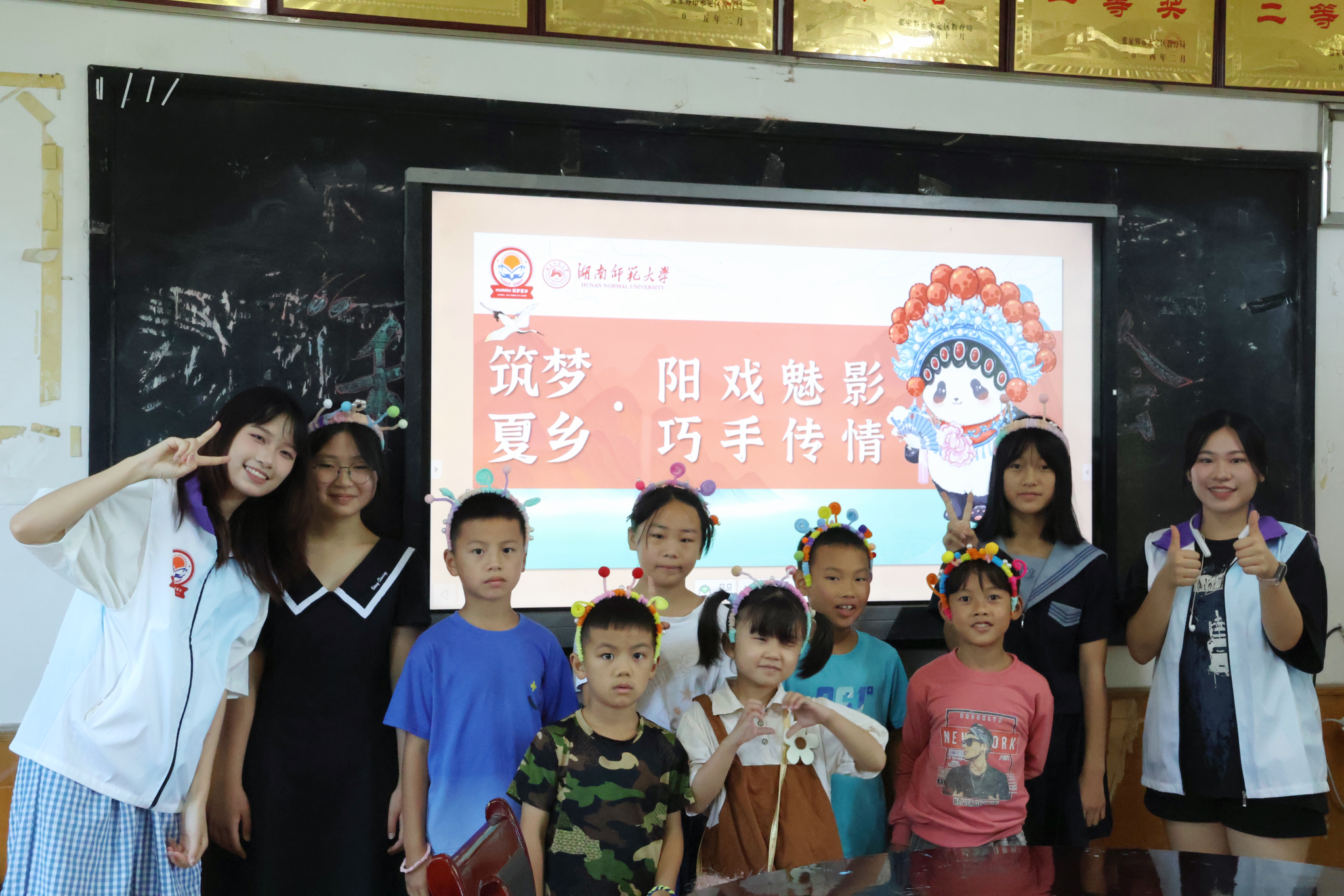 为增强孩子们对于张家界阳戏的体验感,吴欢借鉴张家界阳戏头饰的样式,使用扭扭棒、发箍等工具开展戏剧发箍制作的手工趣味课堂。考虑到发箍制作难度与工具使用的安全问题,服务队队员合理分工,为孩子们的人身安全与良好的课堂体验感保驾护航。制作过程中,孩子们并不拘泥于老师所展示出的发箍样式,而是发挥想象力,巧妙运用工具制作出了各式各样的发箍。课后,服务队队员与孩子们合影留念,为这堂手工趣味课画上句号。