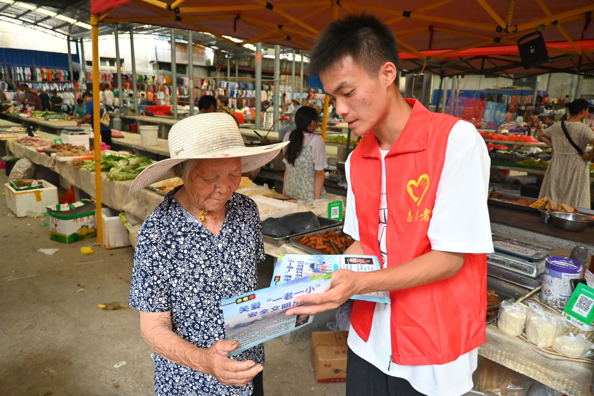 支教队成员在集市分发传单