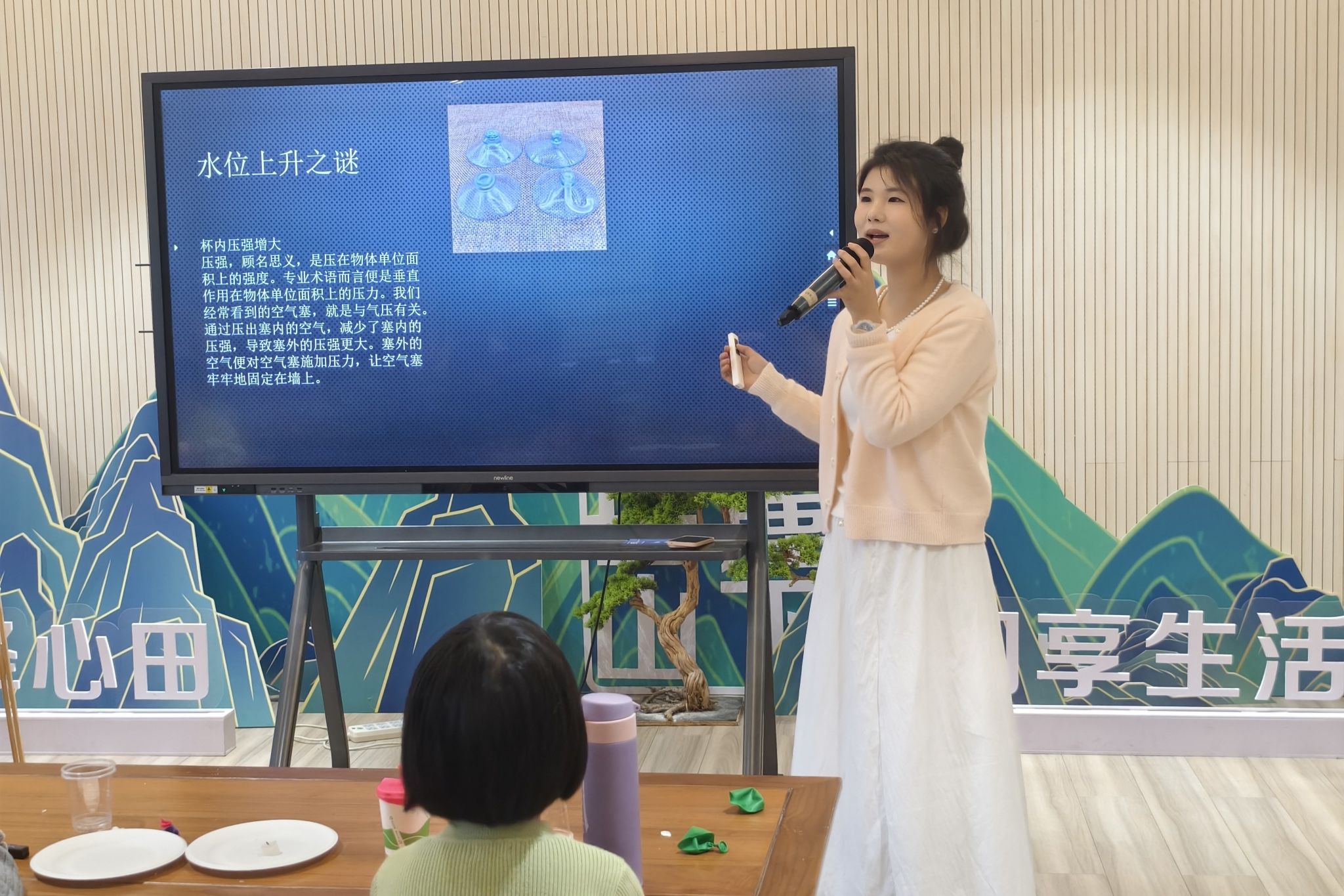 实验开始前,符佳慧运用生动形象的图文资料,讲解了“空气炮”与“会吸水的杯子”两个趣味实验的原理,引导小朋友们思考完成实验。原理讲解完毕后,志愿者们分发实验道具,组织小朋友们有序就坐,演示实验过后,志愿者们耐心指导家长与孩子们一起动手完成实验。实验过程中,志愿者们细心解答小朋友们的疑问,鼓励他们动手操作、积极思考,带领他们深刻感受物理知识的魅力。