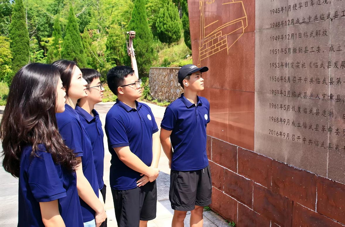 在基地内镌刻临武解放历史的大型纪念碑前,实践队成员研读碑文内容。该碑文系统记载了自1945年侵华日军过境临武至1949年临武解放的关键历史事件。通过图文资料,成员们了解了临武人民在中国共产党领导下争取解放的斗争历程和革命先辈英勇奋斗的精神品质。