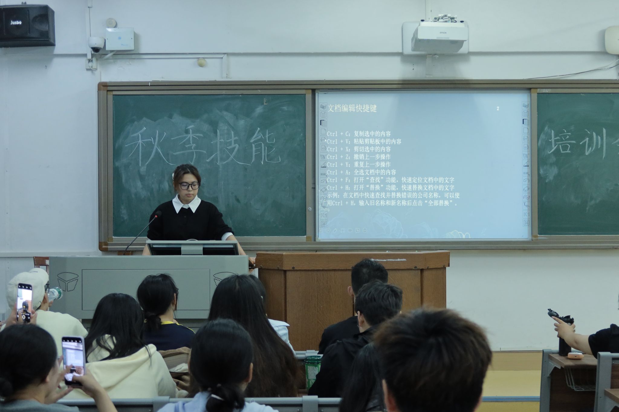 培训中,主讲人主要讲解WPS板块重点讲解高频快捷键、空白页删除方法及格式刷用法,解决文档编辑痛点。在视频剪辑环节,宣传部部长石睿昕以“构思—选材—实操”为线,明确VLOG与宣传视频的内容设计方向,区分主线和辅助素材,结合剪映演示素材导入、粗剪细剪、加字幕转场及导出流程,确保零基础成员可快速上手。会议过程中,同学纷纷拍照记录。