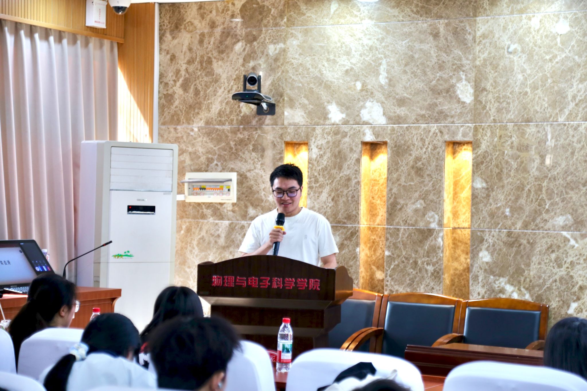 五位同学分享结束后,胡景谱老师作点评总结。他首先肯定了主讲人对抗战精神重要意义与当代价值的认知,以及将其落脚于现实生活的讲述。同时也对五位同学提出期望,希望主讲人可以进一步把弘扬伟大抗战精神与物电学子的日常科研、学习相结合,进一步阐述物电青年在推动教育、科技、人才一体化发展中如何脚踏实地,敢为善为,并号召同学们从立足自身实际,投身实践行动。