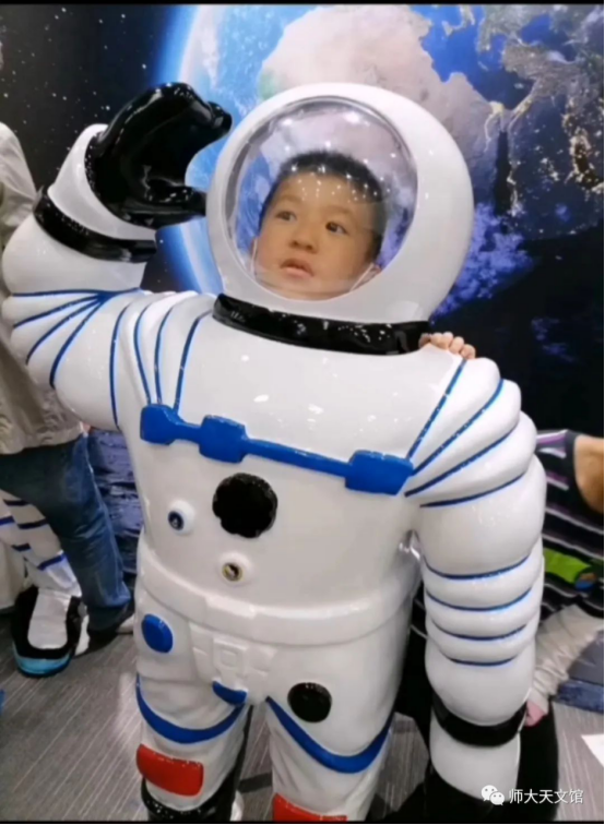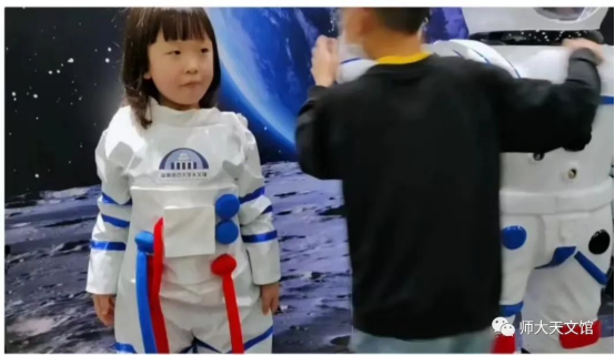 能让参观者参与互动体验的科普场馆,更具有活力和生命力,更能让参观者有共鸣并留下美好的回忆。在天文馆六楼,我们设置了以登陆月球为背景的宇航员体验区。小朋友们热情高涨地试穿体验并拍照留念,激发了他们对浩瀚宇宙的好奇和对科学世界的探索。
