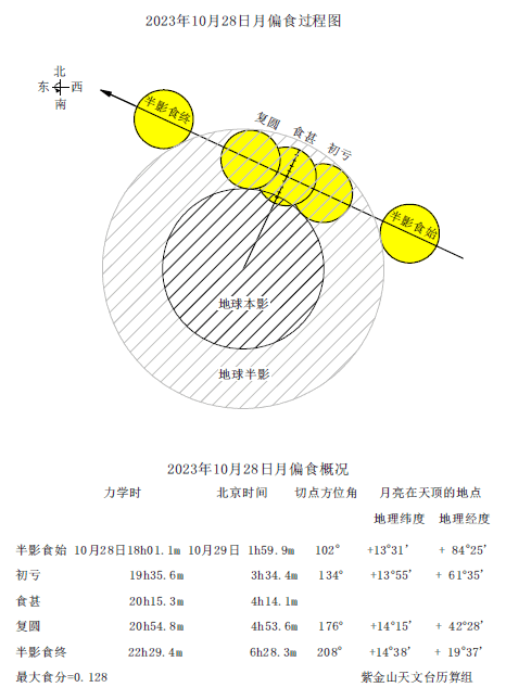 北京时间2023年10月29日(力学时10月28日)将发生月偏食。这次月食,在北美洲东北部、南美洲东部、大西洋、欧洲、非洲、印度洋、亚洲、大洋洲西部、北太平洋西部、北冰洋、南极洲极小部分可以看到。本次月食自北京时间29日2时0分半影食始、3时35分初亏、4时14分食甚、4时54分复圆、6时28分半影食终。全部过程历经4小时28分钟,其中本影食历时1小时19分钟。