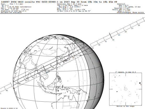 小行星在背景星空中移动时,有时会遮掩远方的恒星,这种现象就是小行星掩星。该项目需要多地联合观测。北京时间2023年10月1日2时32分,推定直径约532.1公里、视星等20.55等海王星外天体(144897)2004UX10遮掩金牛座11.64等恒星TYC 0650-00980-1,最长见掩时长31.0秒,减光(亮度下降)8.9等,月球在地平线下。