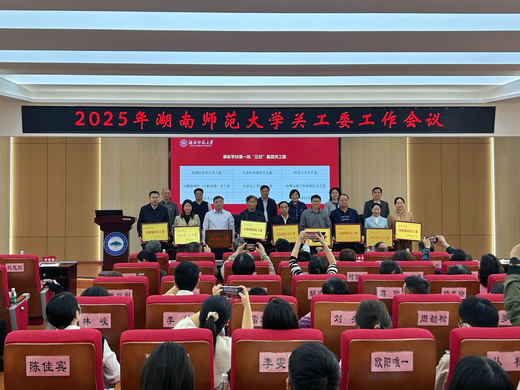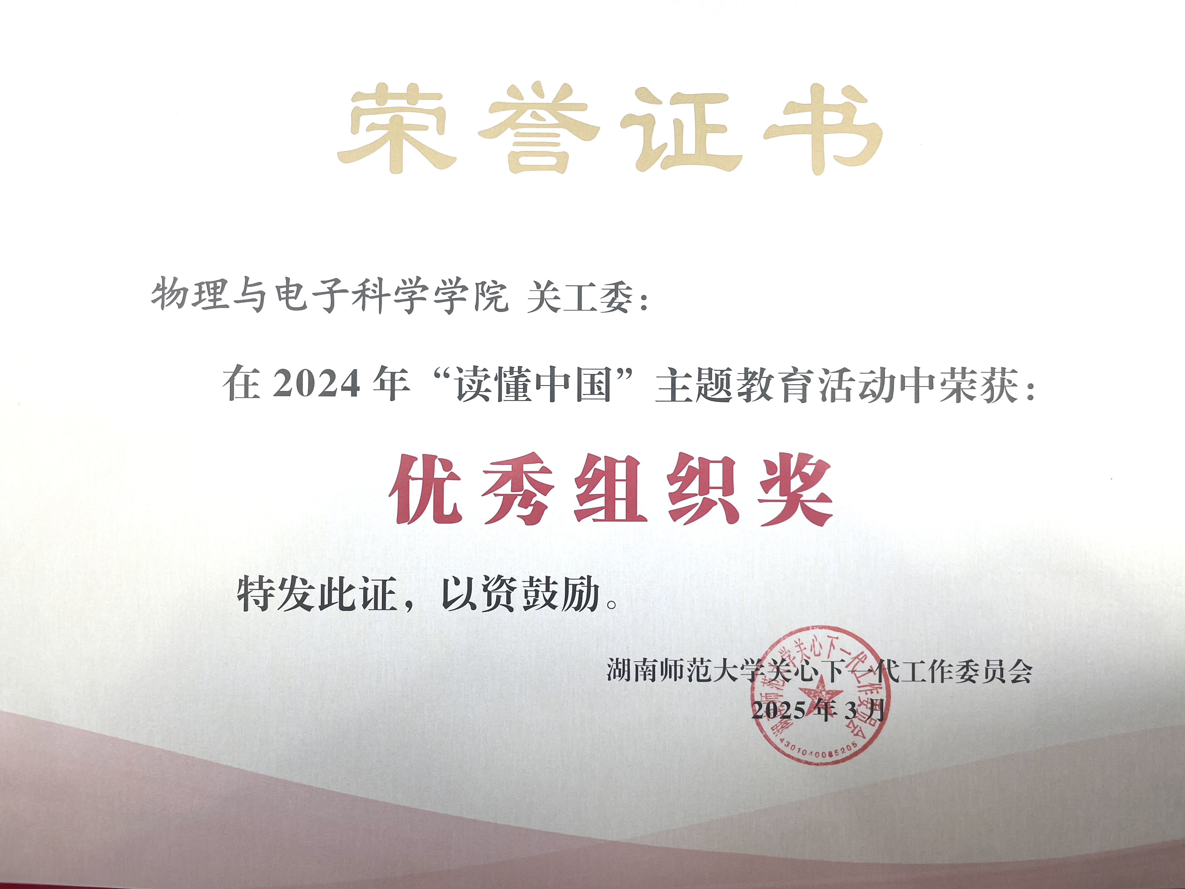 (通讯员 罗瑞霞)3月25日,湖南师范大学关工委于地理科学学院301报告厅召开2025年工作会议。物电院关工委荣获学校第一批“五好“基层关工委,“读懂中国”主题教育活动优秀组织单位,“一院一品”优秀项目单位,物电院关工委为包揽三大奖项的两家单位之一。院长刘红荣、党委书记罗嵘被评为“关工委工作积极支持者”,党委副书记郭铭伟、关工委常务副主任唐咸林被评为“关工委工作先进个人”。