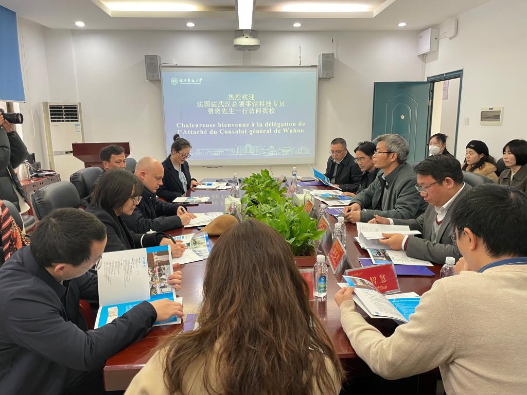 唐东升对法国驻武汉总领事馆代表表示热烈的欢迎,并简要介绍了我院办学的整体情况。欧阳钢介绍了我院研究生的培养情况,就合作协同育人等事宜进行了热烈讨论。廖洁桥介绍了我院学科建设、科学研究情况,表示愿意进一步加强与法国高校和研究机构之间的交流合作。会上教师代表就科研合作事宜进行了深入讨论交流。