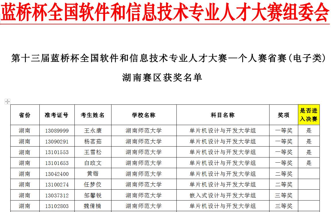(供稿 周丹 邹孝)近日,由工业和信息化部人才交流中心主办的第十三届“蓝桥杯”全国软件和信息技术专业人才大赛圆满落幕,我院电子信息科学与技术专业9名学生参加比赛,获得电子类省一等奖4项、二等奖2项、三等奖2项,其中4人被推荐参加全国总决赛,最终获得全国一等奖2项。