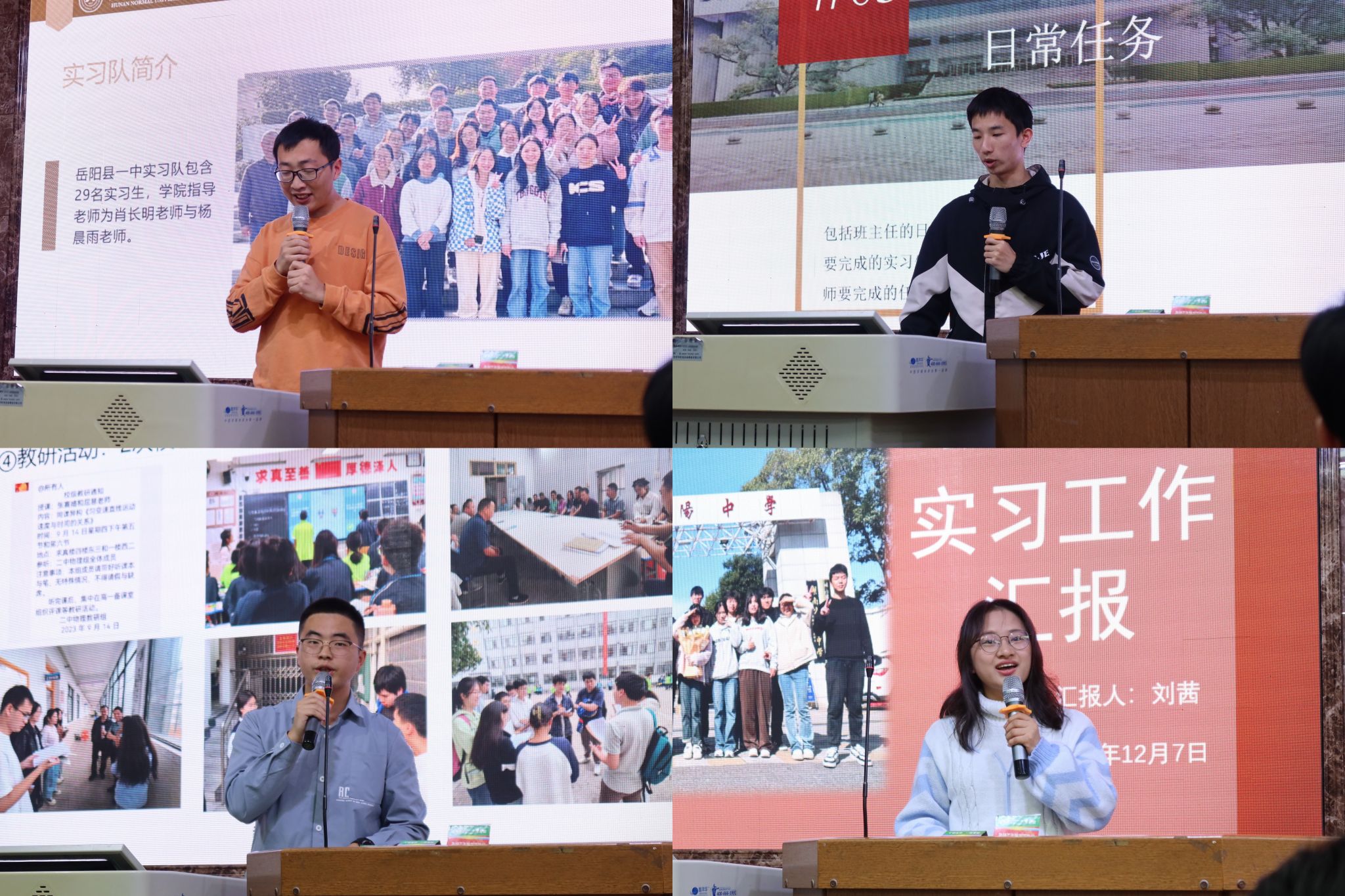 2020级12位实习队队长按抽签顺序依次进行实习汇报。各实习队队长从师范技能教育培训、指导老师工作、物理教学等方面,依次汇报实习期的教学工作进展与总体落实情况,并围绕实习以来的教育及教学实习经历分享心得体会。