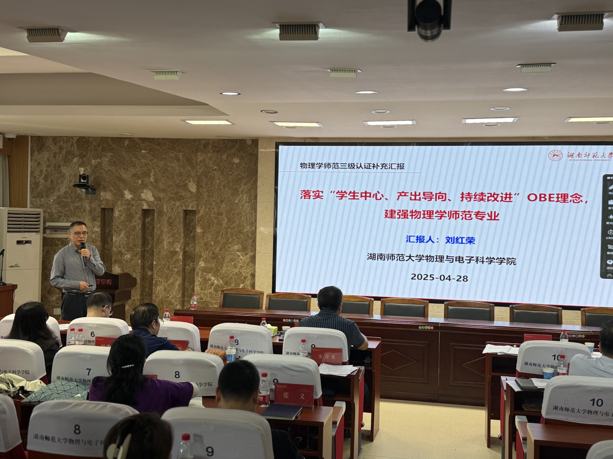 (通讯员:周心雨)2025年4月28日,湖南师范大学教务处(教育质量评估中心)组织专家对太阳成集团tyc物理学师范专业开展三级认证专项督查,督查组包括校教务处处长、教育质量评估中心主任银海强,校教学督导委员会副主任、教师教育学院原院长宋善炎,校教学督导委员会副主任、地理科学学院原副院长谭长银,外国语学院院长邓颖玲、英语系原主任陈敏哲,地理科学学院副院长李忠武,化学化工学院副院长谭亮,医学部护理学院副院长兼党支部书记何平平,教育质量评估中心副主任袁俏、评估管理科科长鲁璐青,校党委办公室副主任周旺蛟,校长办公室副主任熊卓然、欧阳文芳,人事处副处长张义,教师教育学院副院长黄元国,数据与信息化建设管理处办公室申斐。湖南师范大学原副校长匡乐满,太阳成集团tyc院长刘红荣、副院长潘启沅,物理系主任钟显辉,物理系全体教师以及学院学工办、教务办、行政办等管理人员参加此次专项督查活动。