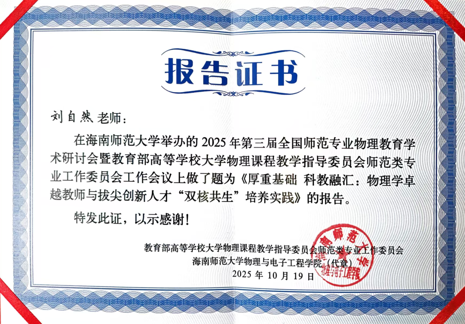 2025年10月17日至21日,第三届全国师范专业物理教育学术研讨会暨教育部高等学校大学物理课程教学指导委员会师范类专业工作委员会会议在海南师范大学顺利召开。同期还举办了第二届物理师范生粉笔字暨板书设计大赛。会议现场,既有高水平的学术报告,也有考验师范生基本技能的板书大赛。