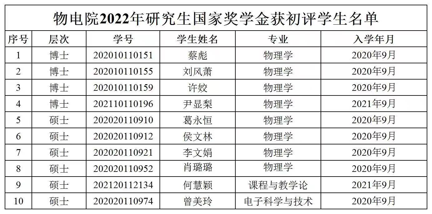 经本人申请,学院研究生学业奖学金评审委员会综合评定,现推荐蔡彪等10位全日制研究生为2021-2022学年国家奖学金获得者并予以公示,公示时间为5个工作日。如有异议,请于公示期内将情况反映至院科研办(电话:88872834)。